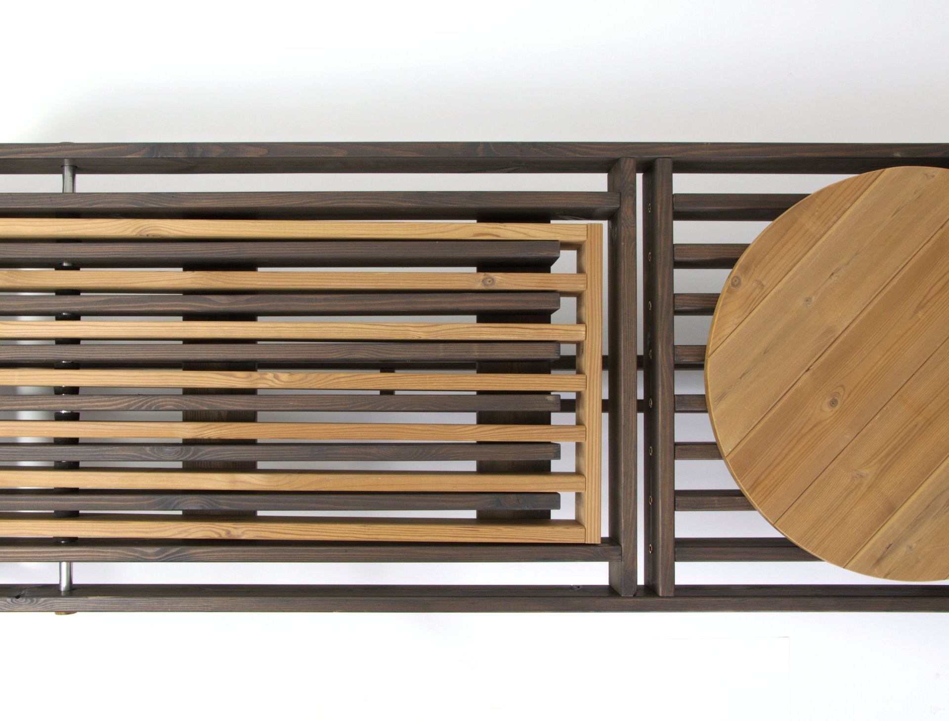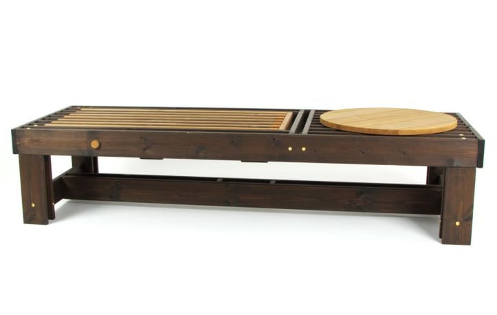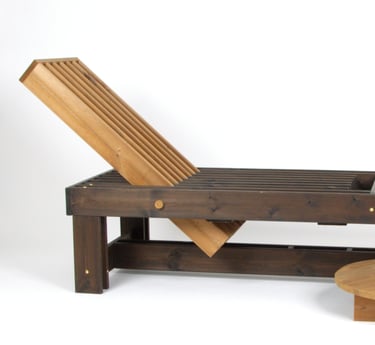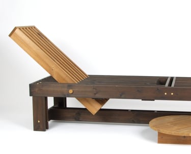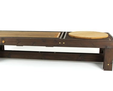 BBQ suoliukas–gultas – tai daugiafunkcis lauko baldas, įkvėptas grilio kultūros estetikos. Jo lentelių ritmas primena grotelių struktūrą, o reguliuojama nugarėlė leidžia rinktis sėdėjimo arba gulėjimo poziciją. Pagamintas iš ilgaamžės termo medienos, suoliukas sukuria patogią ir vizualiai išraiškingą poilsio zoną. Multifunkcis ovalus padėkliukas įstatomas tarp lentelių, todėl gali būti naudojamas kaip mini staliukas. Tai modernus, praktiškas ir estetiškas sprendimas lauko erdvėms.