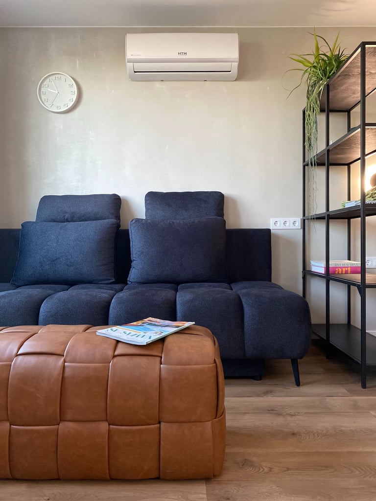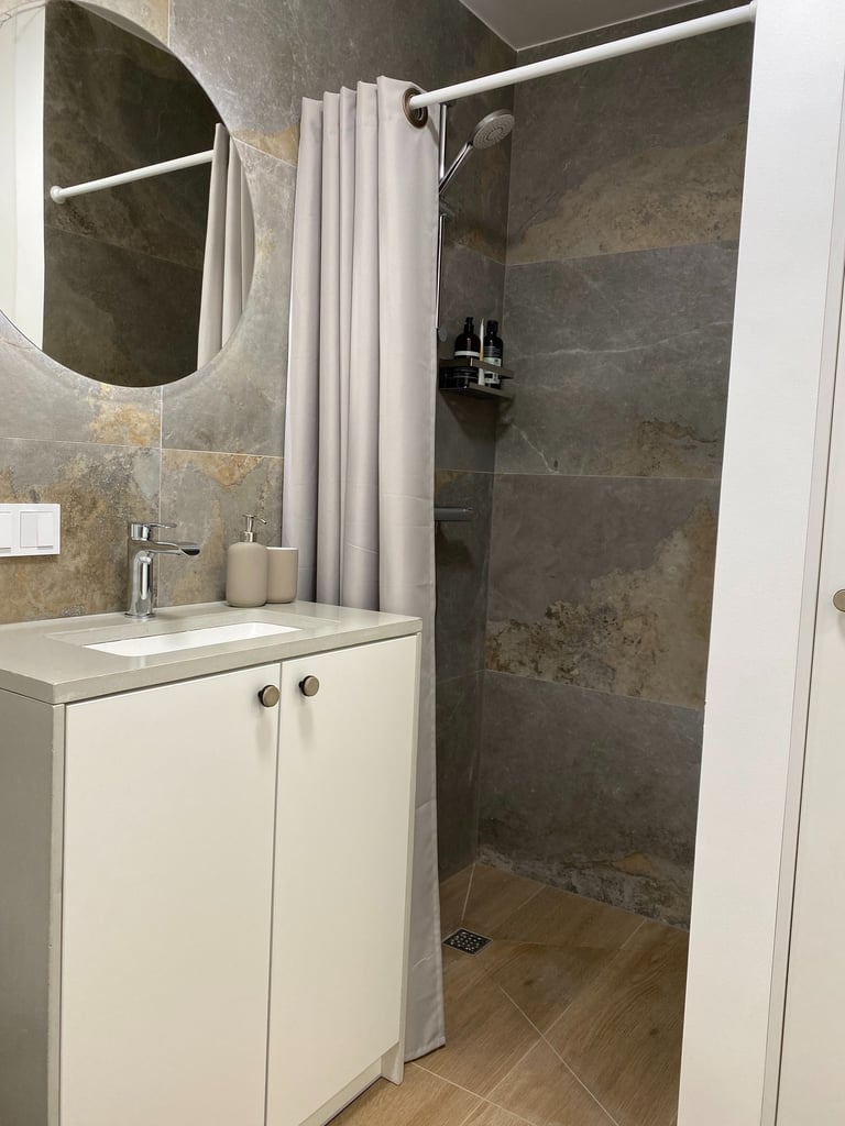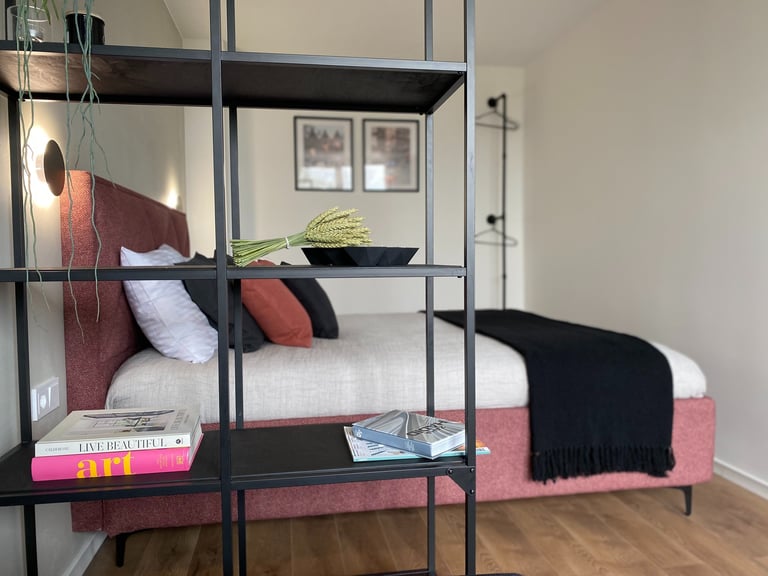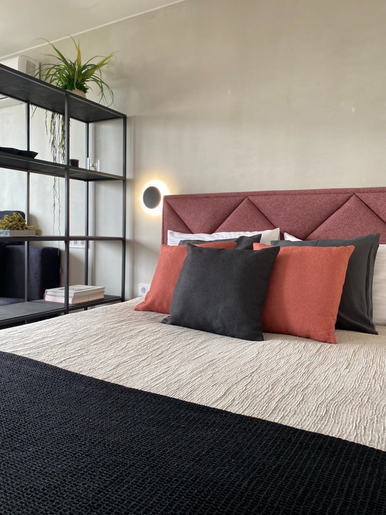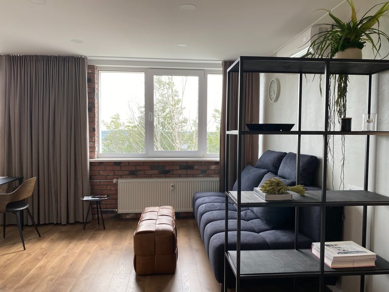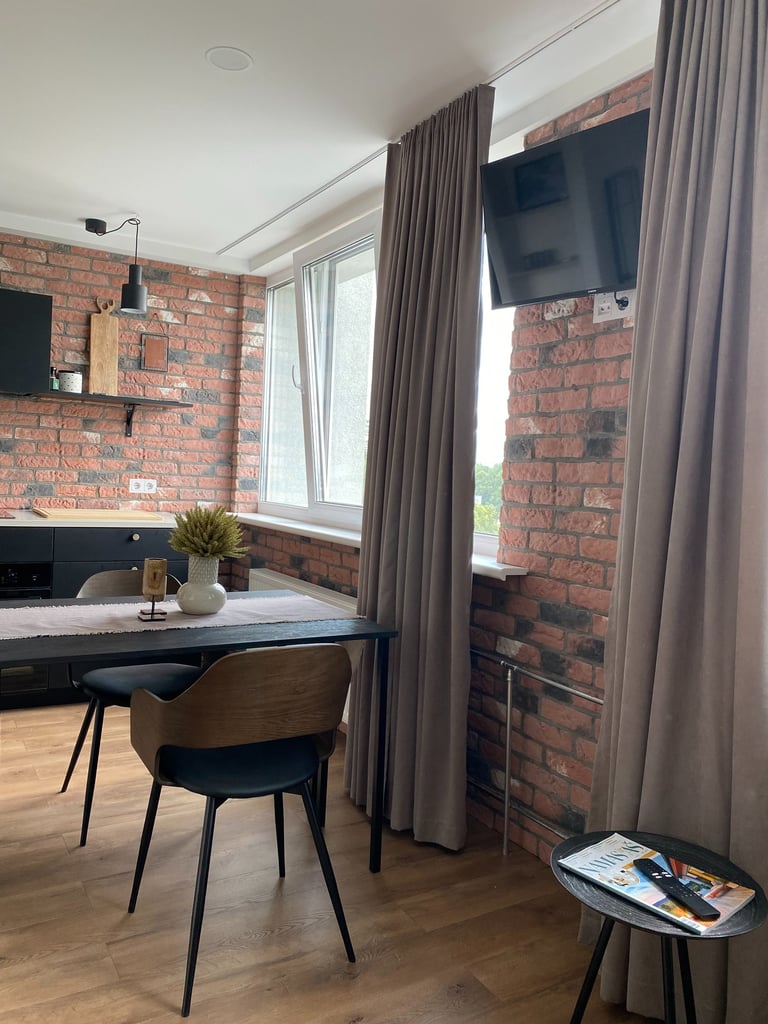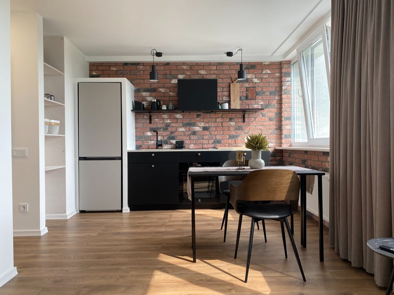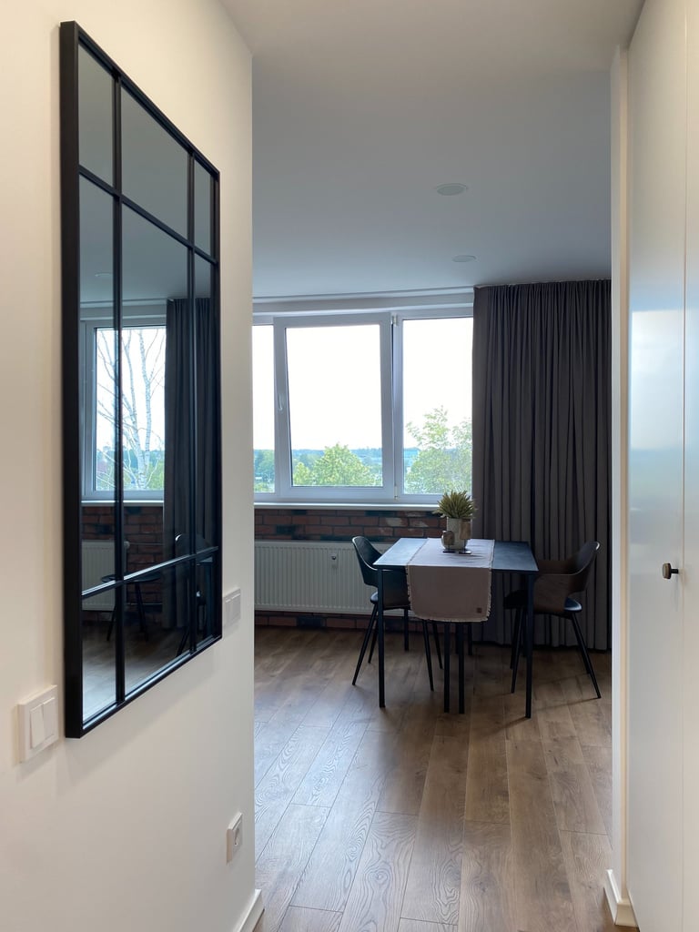 Šis kompaktiškas 35 m² butas suprojektuotas taip, kad maksimaliai išnaudotų erdvę ir sukurtų vientisą, modernią gyvenimo zoną. Originalus dviejų kambarių išplanavimas buvo pakeistas į atvirą studijos tipo erdvę, o miegamoji zona subtiliai atskirta lengva metaline lentyna. Tokiu būdu išlaikomas privatesnis poilsio kampas, tačiau nepanaikinamas erdvės pojūtis. Bute dominuoja modernus, stilistiškai darnus industrinis dizainas su šiuolaikiškų namų jaukumu.